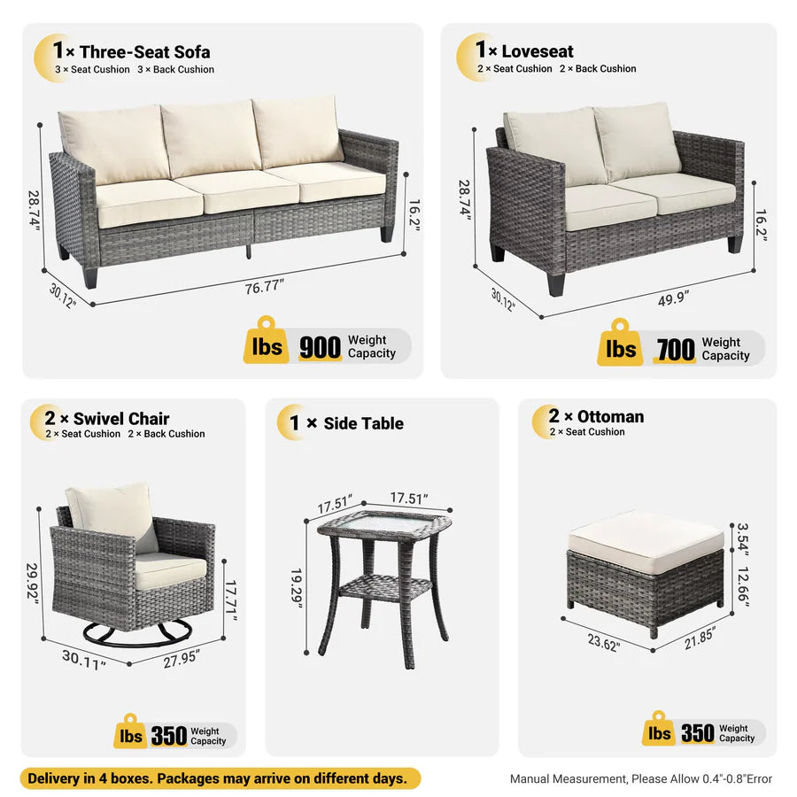 Items Included | PCS include: Sofa*1,Loveseat*1, Swivel Chair*2, Ottoman*2, Table*1 |