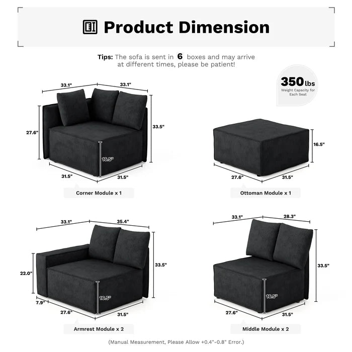 Modular Design: Comes with 6 separate modules (2 armrest modules, 2 middle modules, 1 corner module, and 1 ottoman), allowing you to reconfigure the layout to suit any space or seating arrangement.