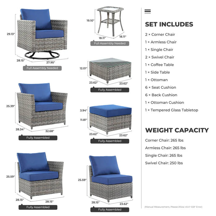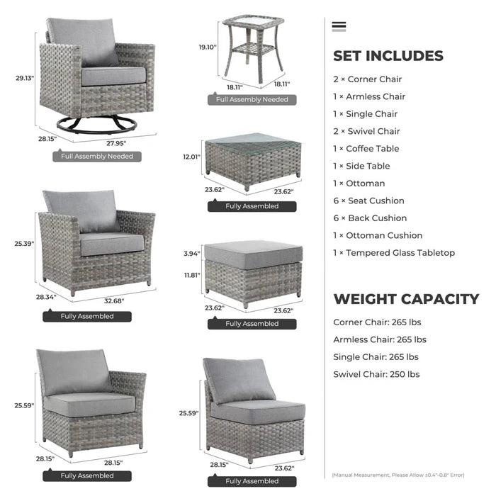 Items Included: | 9 PCS include: Fully Assembled: Corner Chair * 2; Armless Chair * 1; Single Chair * 1; Ottoman * 1; Coffee Table * 1; Assembly needed: Swivel Chairs * 2; Side Table * 1 |