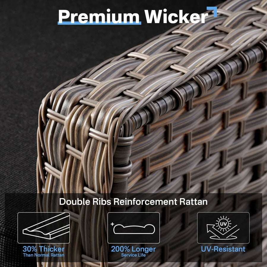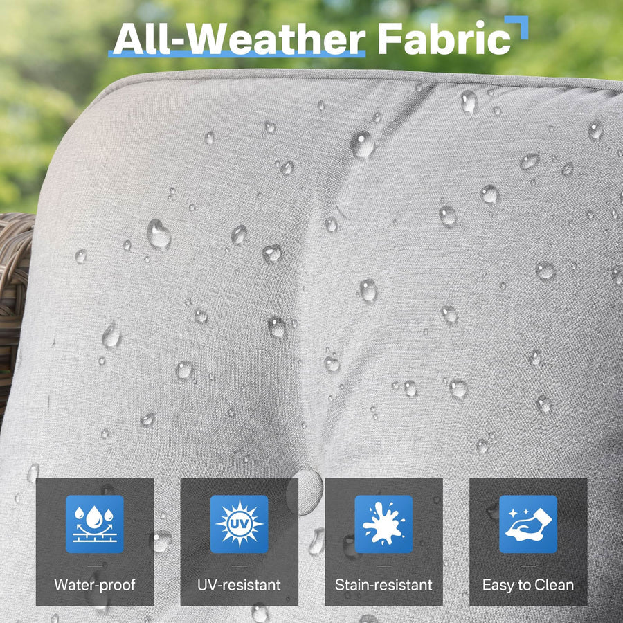 STURDY & DURABLE CONSTRUCTION:Our outdoor furniture is crafted from premium materials. The metal frame is 50% thicker than average, supporting 350 lbs and featuring a three-step coating for enhanced resistance to scratches, peeling, and rust. The all-weather PE wicker is tightly woven to withstand rain, tears, and fading. The cushions' fabric, made with 100% solution-dyed technology, retains color, repels water, and resists spills and stains.