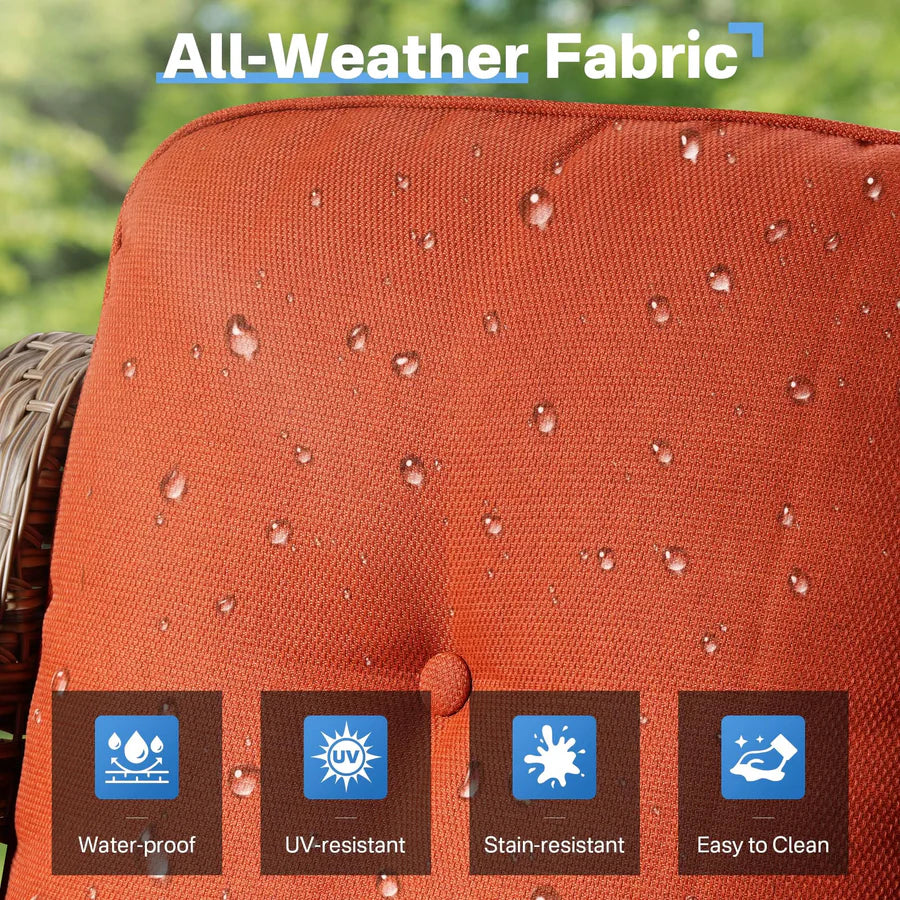 STURDY & DURABLE CONSTRUCTION:Our outdoor furniture is crafted from premium materials. The metal frame is 50% thicker than average, supporting 350 lbs and featuring a three-step coating for enhanced resistance to scratches, peeling, and rust. The all-weather PE wicker is tightly woven to withstand rain, tears, and fading. The cushions' fabric, made with 100% solution-dyed technology, retains color, repels water, and resists spills and stains.