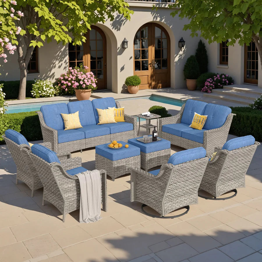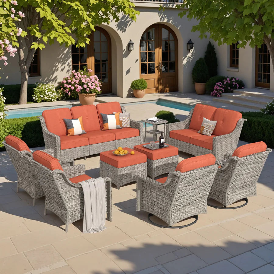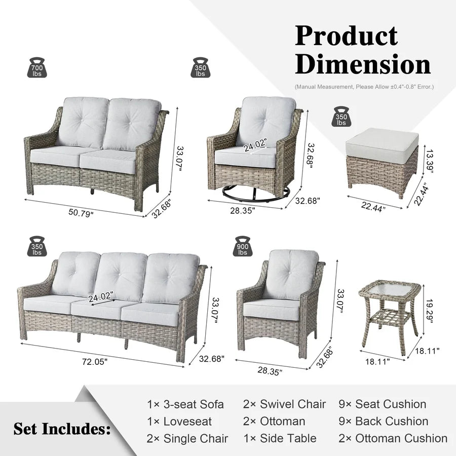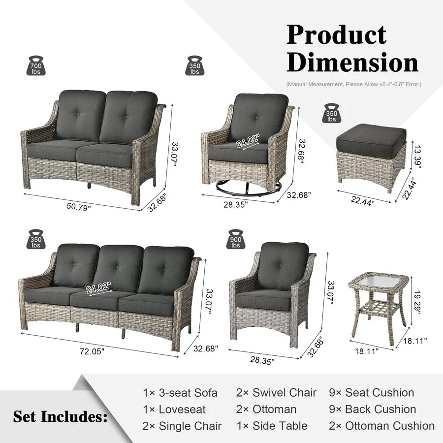 VERSATILE OUTDOOR FURNITURE: This set comprises 1 x 3-seat couch,1 x 2-seat couch, 2 x swivel rocking chairs, 2 x single chairs, 2 x ottomans, and 1 x 18" side coffee table, offering seating for up to 7. Its sleek, contemporary design enhances any outdoor setting. Ideal for family reunions, social drinks, or quiet book reading, this patio set enhances your outdoor area.