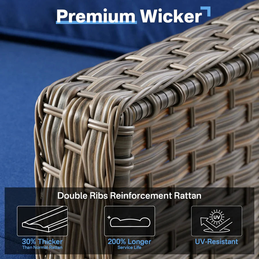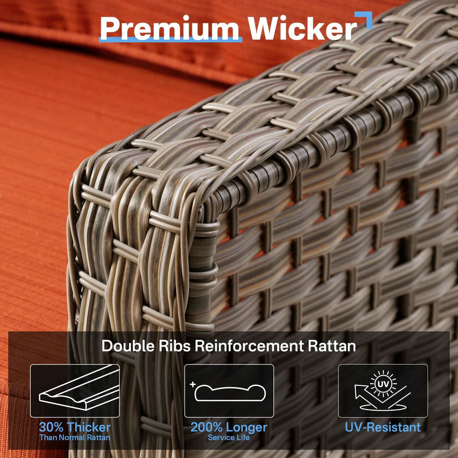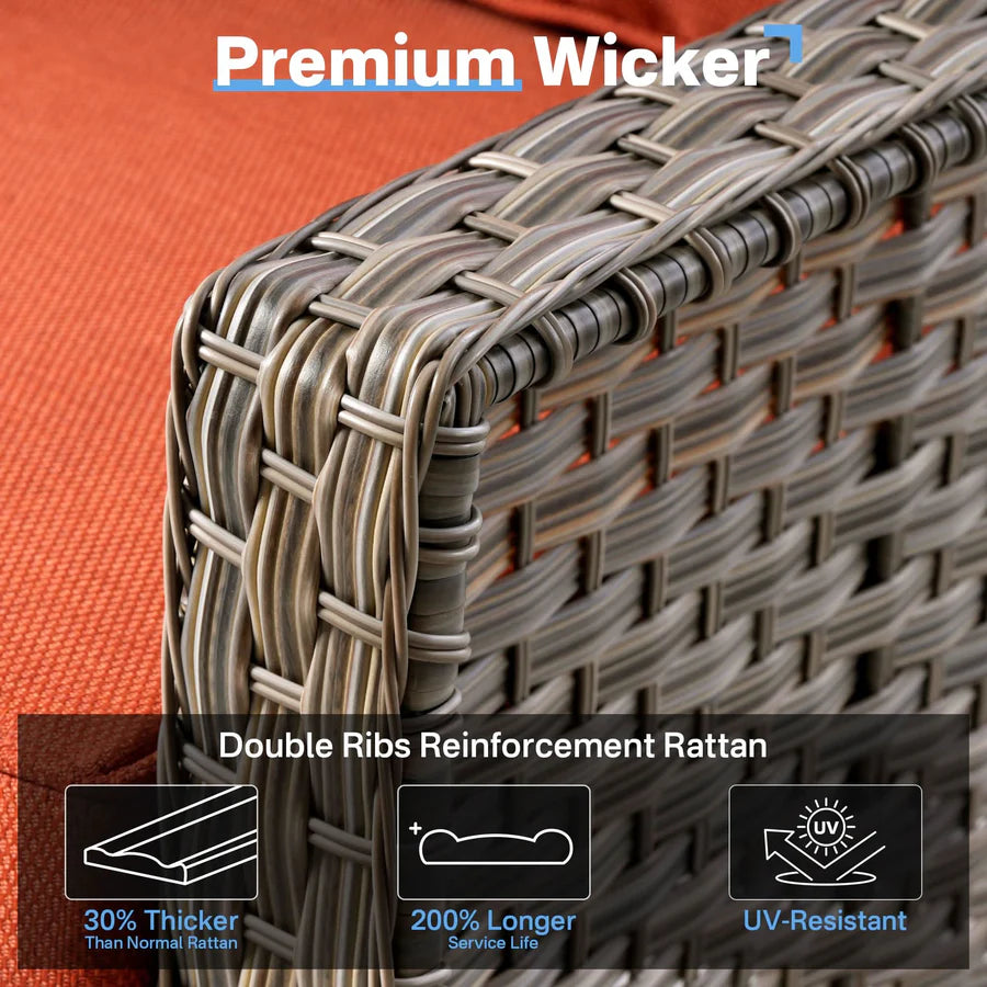 STURDY & DURABLE CONSTRUCTION:Our outdoor furniture is crafted from premium materials. The metal frame is 50% thicker than average, supporting 350 lbs and featuring a three-step coating for enhanced resistance to scratches, peeling, and rust. The all-weather PE wicker is tightly woven to withstand rain, tears, and fading. The cushions' fabric, made with 100% solution-dyed technology, retains color, repels water, and resists spills and stains.