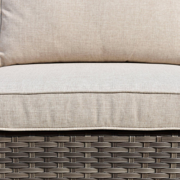Outdoor Sofa Set: Enjoy leisure time with friends and family in the comfort of Ovios outdoor sectional with plenty of room for five.