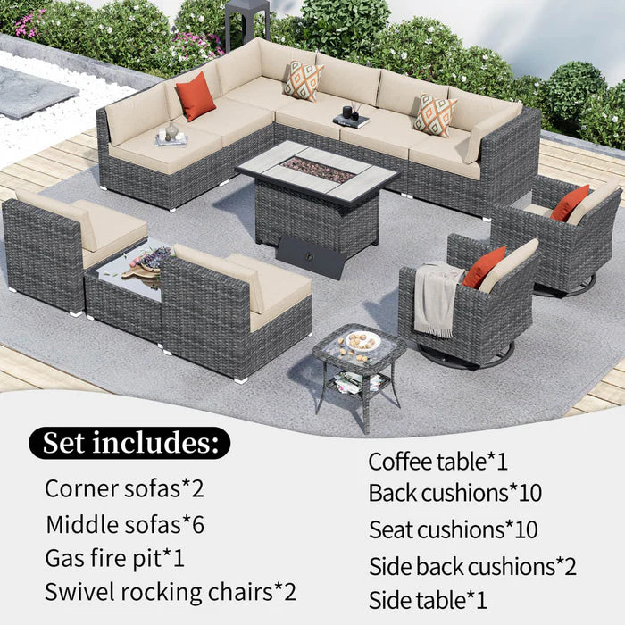 Items Included | Sectional Includes 13 Pieces: Corner Sofa x 2, Middle Sofa x 6, Tempered Glass Coffee Table x 1, Side Table x 1, Rocking Chair x 2, Gas Fire Pit x 1, Cushions x 22 |