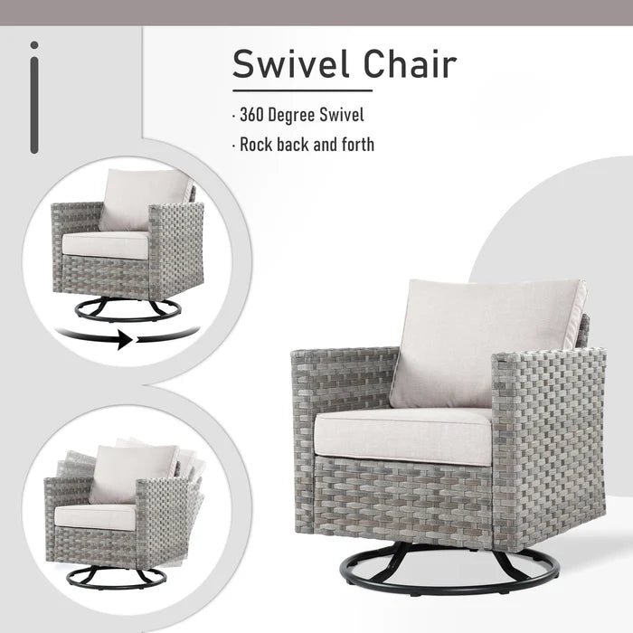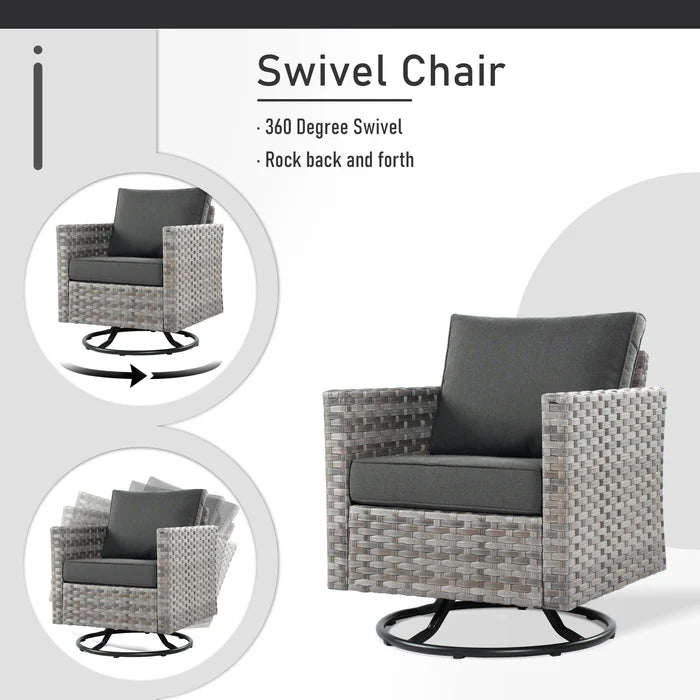 Items Included: | 8 PCS include: Fully Assembled: Corner Chair * 2; Armless Chair * 1; Single Chair * 2; Ottoman * 1; Coffee Table * 2; Assembly needed: Fire Pit Table * 1;Swivel Chair * 2; Side Table * 1 |