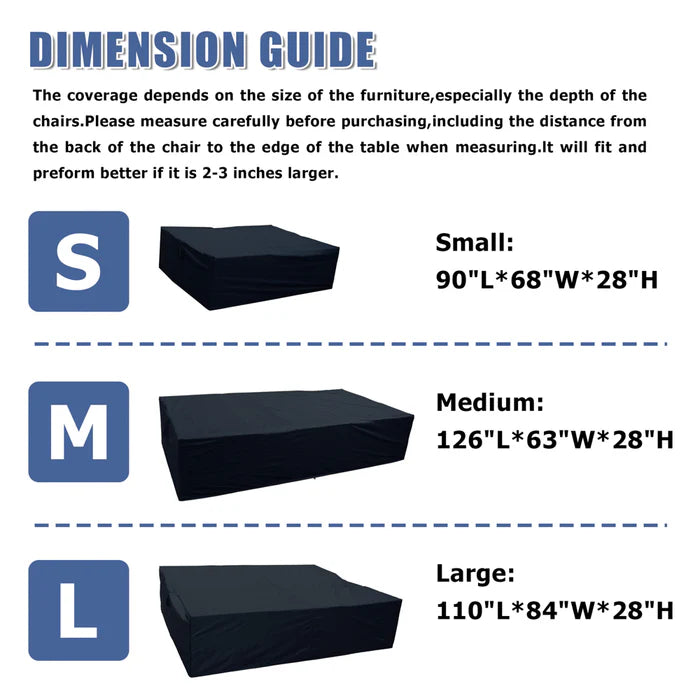 Large Patio Cover for Outdoor Furniture: Outdoor furniture covers are also suitable for most patio sectional sofas, outdoor table chairs, and various rectangular/round/oval patio furniture sets. Please make sure your furniture size before you purchase.