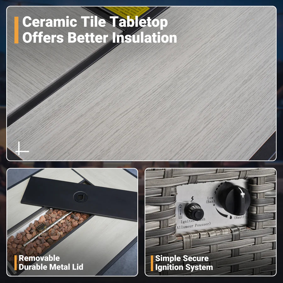 Safety Assurance:Certified at 50,000 BTU, the fire pit table comes with a safety valve for worry-free use. Powered by propane, it guarantees stable and eco-friendly burning, freeing you from ash and smoke concerns. Enjoy a secure and environmentally conscious outdoor ambiance.