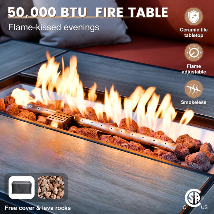 Safety Assurance:Certified at 50,000 BTU, the fire pit table comes with a safety valve for worry-free use. Powered by propane, it guarantees stable and eco-friendly burning, freeing you from ash and smoke concerns. Enjoy a secure and environmentally conscious outdoor ambiance.